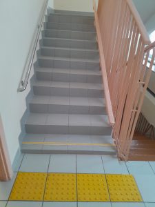 – нанесены противоскользящие полосы желтого цвета на проступях краевых ступеней лестничных маршей; и тактильная плитка перед ступенями